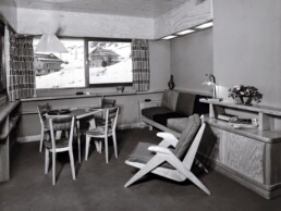 C’est dans ce contexte que Perriand, passionnée de montagne, revient à Méribel, station imaginée dès les années 1930 par son ami, le promoteur écossais, Peter Lindsay. C’est ce dernier qui va la solliciter vers 1949, pour plusieurs projets, notamment l’aménagement des hôtels « Le Vallon », puis « Le Doron » et de chalets individuels.