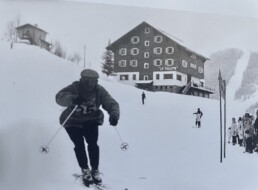 Skieur devant l’hôtel « Le Vallon » dans les années 1950.
