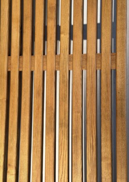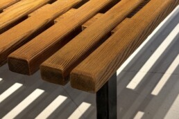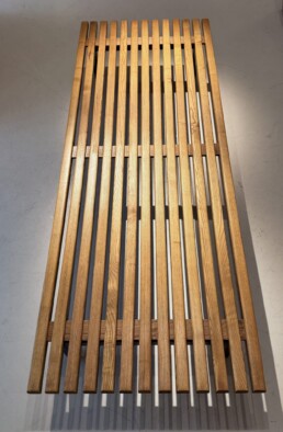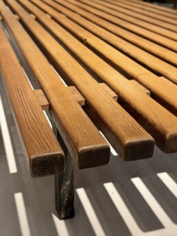 Banc en frêne massif, sur un piétement en métal laqué noir.