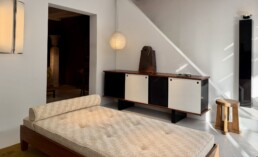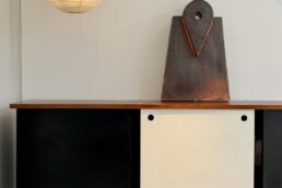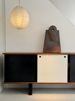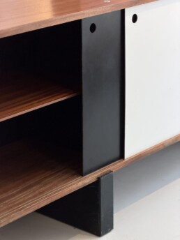 Buffet dit « Bloc » en bois, placage acajou et tôle d’acier pliée, portes stratifiées, blanc et noir.