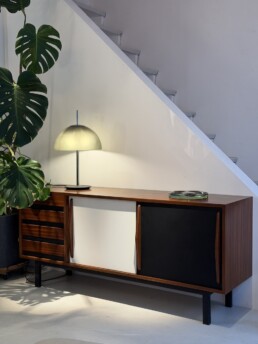Buffet en placage acajou, 2 portes coulissantes en formica noir et blanc, 4 tiroirs. Piétement en métal laqué noir.