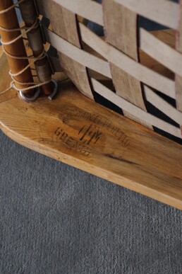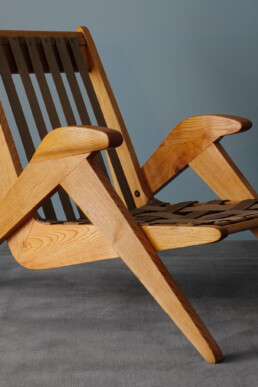 Structures réalisées en frêne massif, les assises sont constituées de sangles de parachute, matériau de récupération d’après guerre.