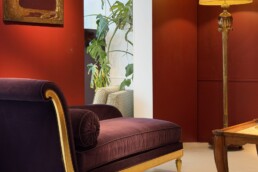 Entièrement regarnie à neuf de velours violet. Petit traversin assorti. France, 1920.