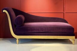 Entièrement regarnie à neuf de velours violet. Petit traversin assorti. France, 1920.
