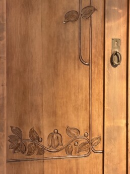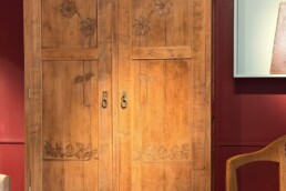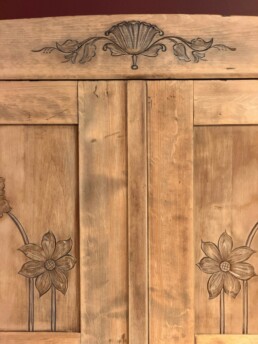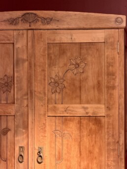 Penderie, Sécession Viennoise. Fabriquée en pin massif. Décoration de plantes et fleurs sur les portes et le fronton, serrure fonctionnelle d’origine avec clé et entrée en fer.