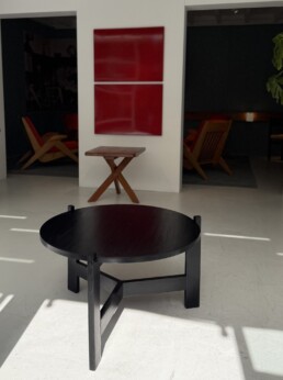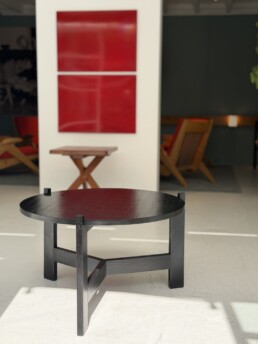 Rare table basse en mélèze et pin laqué noir.