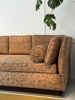 Macassar ebony veneer chaise longue with a solid, shaped metal base in silver and gilt. Seat and cushions entirely upholstered in brown satin with a pattern designed by Jacques-Émile Ruhlmann for the Prelle factory. Two small tears on the seat.